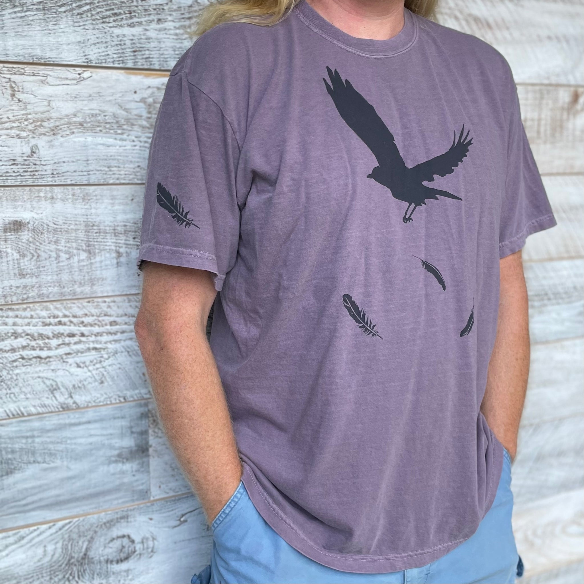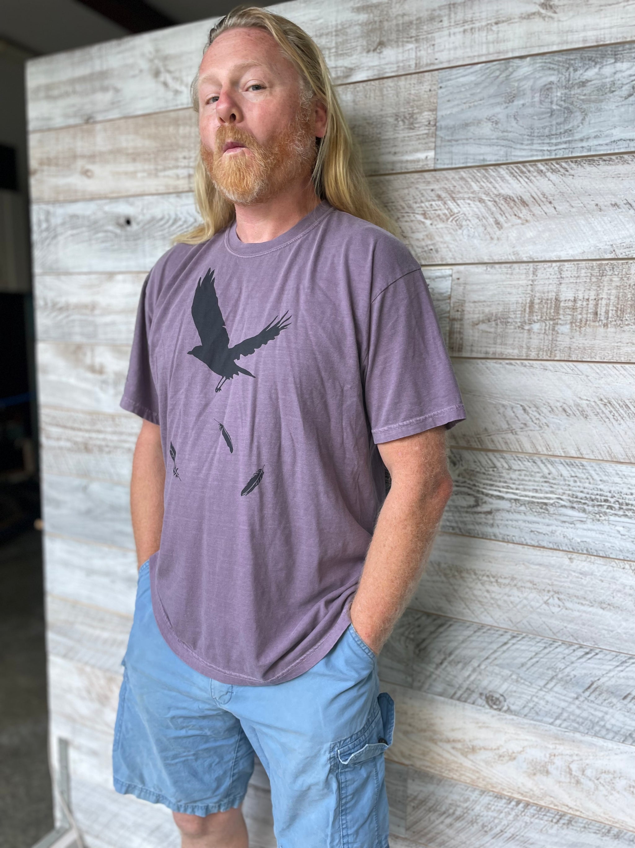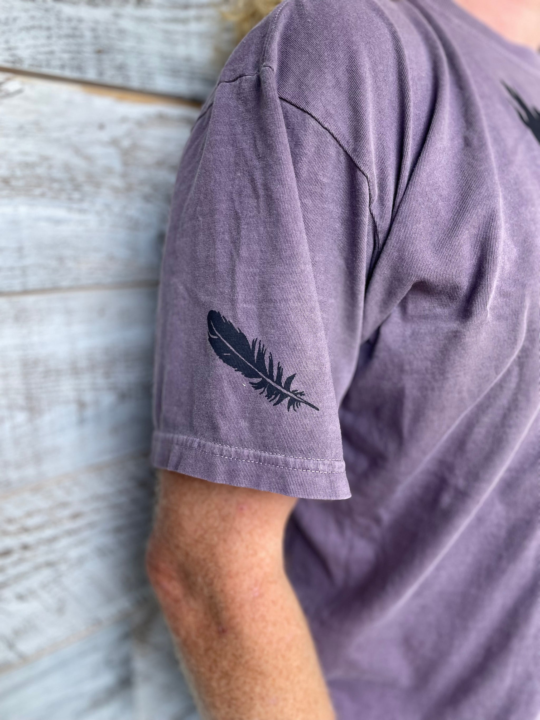 This unique design is printed on 100% Ringspun Cotton. Β The ink is a dark rich purple/blue/black color and the shirt is a light purple color. Β You can find on the sleeve a fun addition print of feather. On the back you will see the Think Greene logo printed on the top neck area.