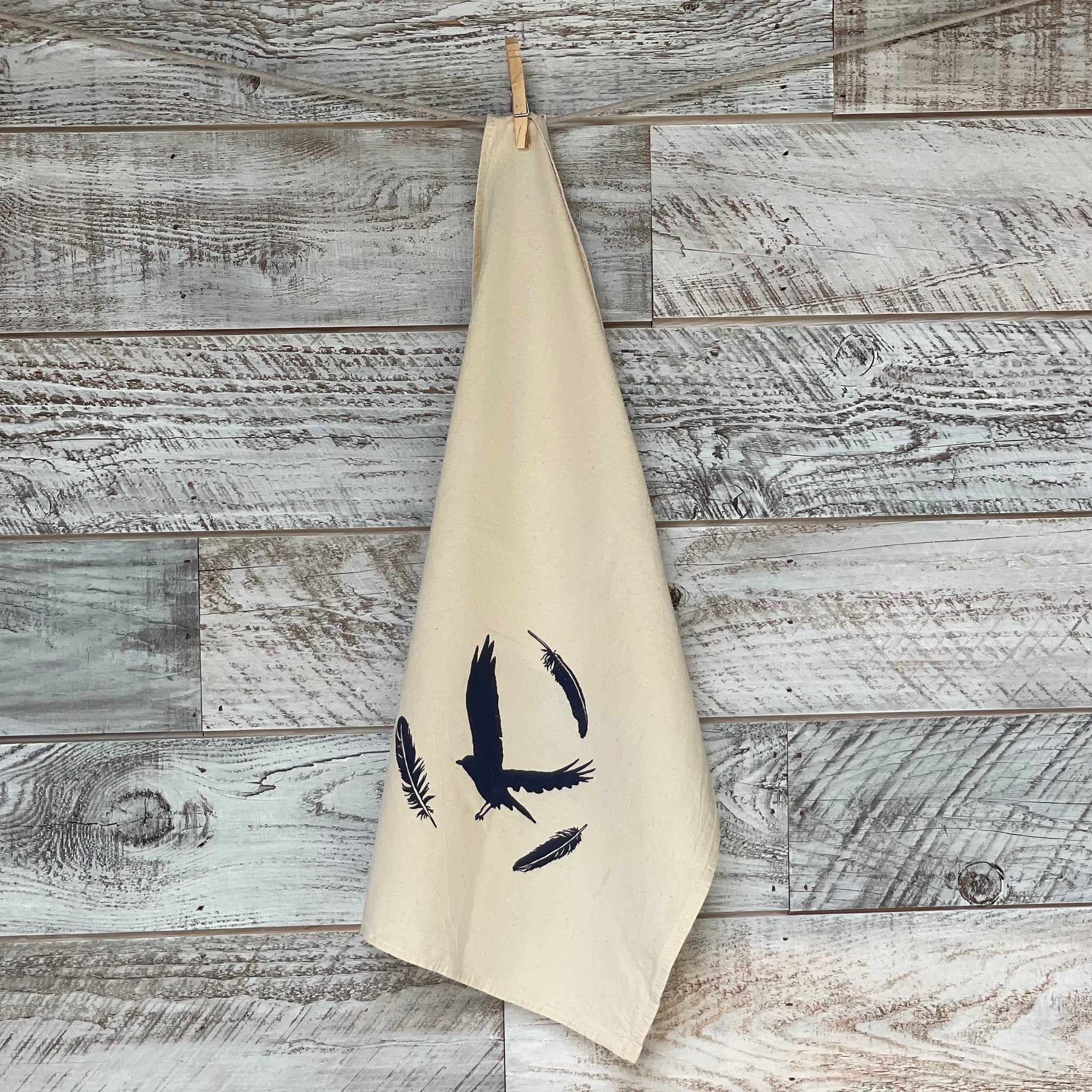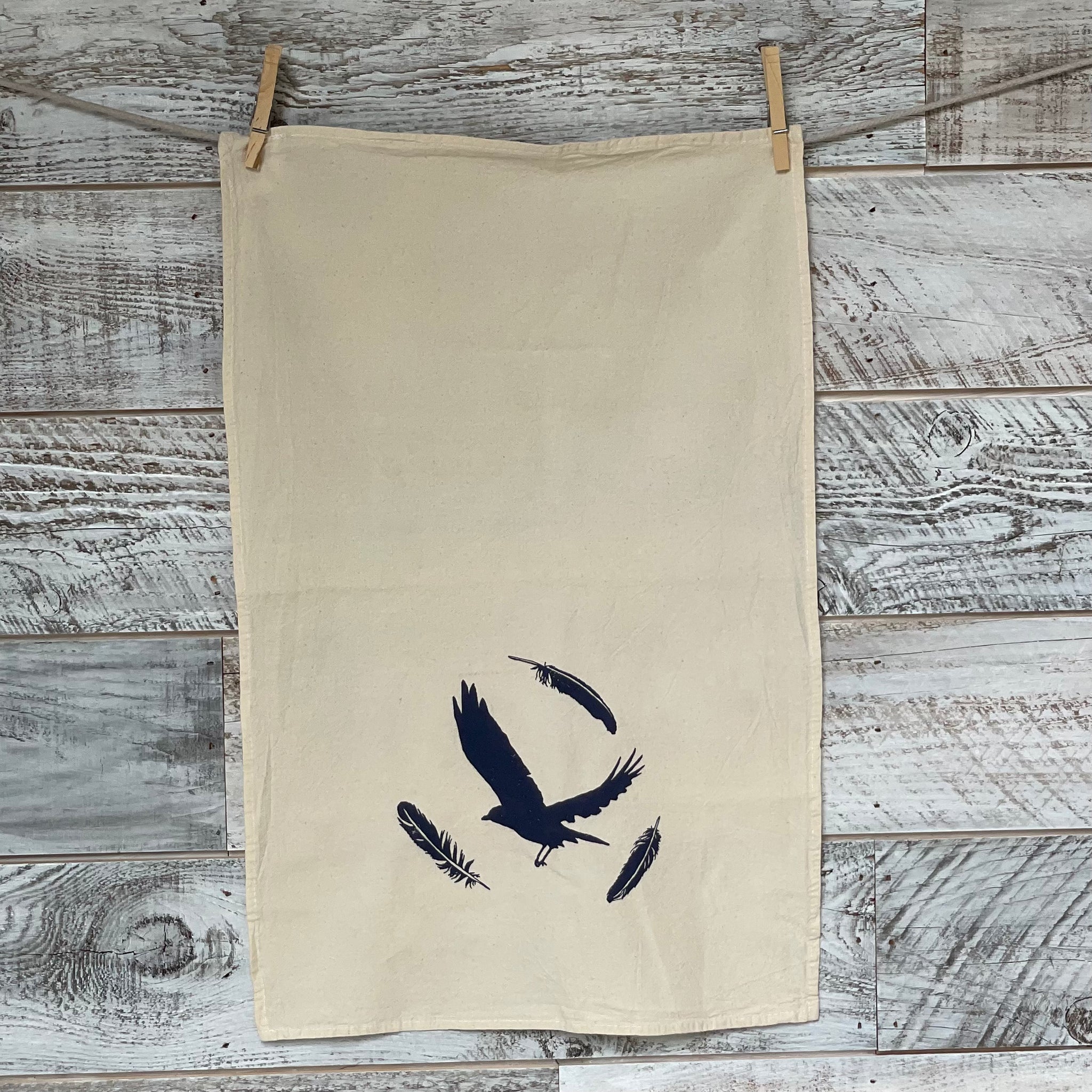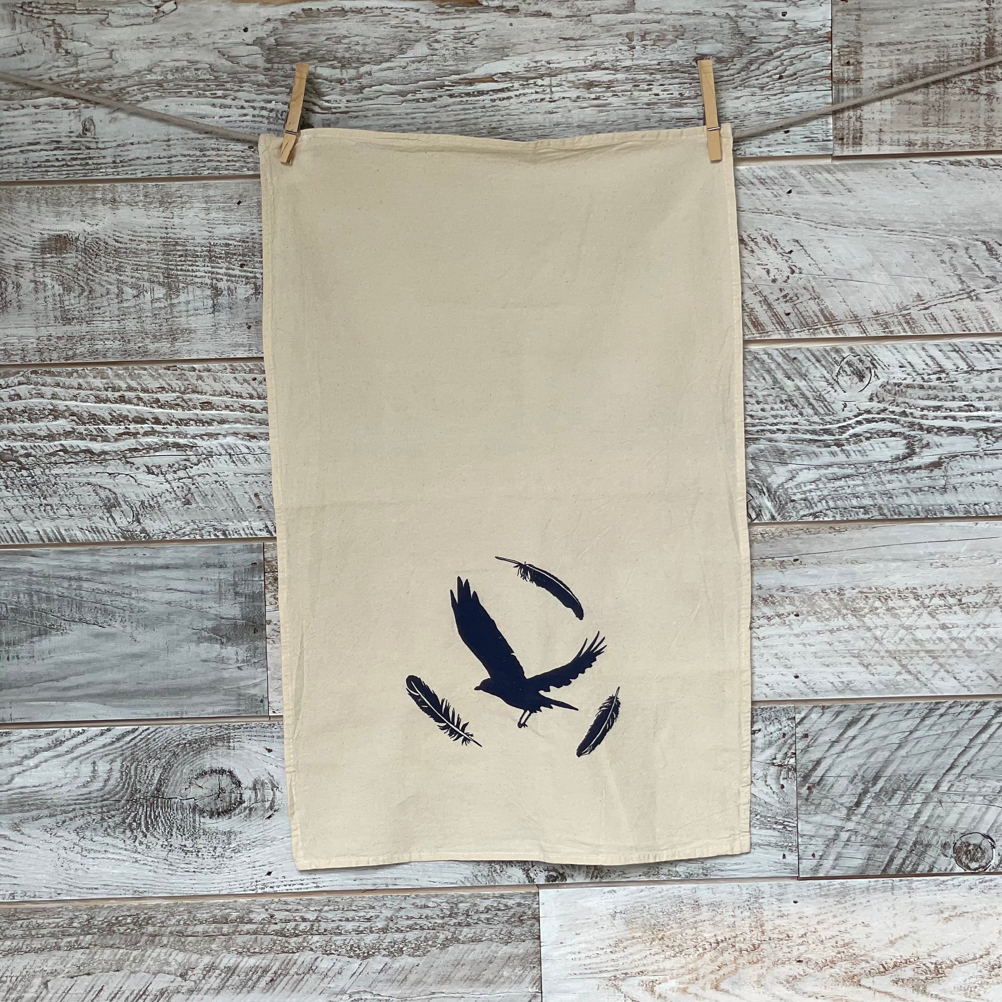 Crow with 3 Feathers design. This tea towel is handprinted onto a 16” x 24” flour sack 100% cotton. There is a loop at the top to hang or you can drape it over your oven door handle. Colors will not fade in the wash and can be cleaned and put in the dryer with other laundry.