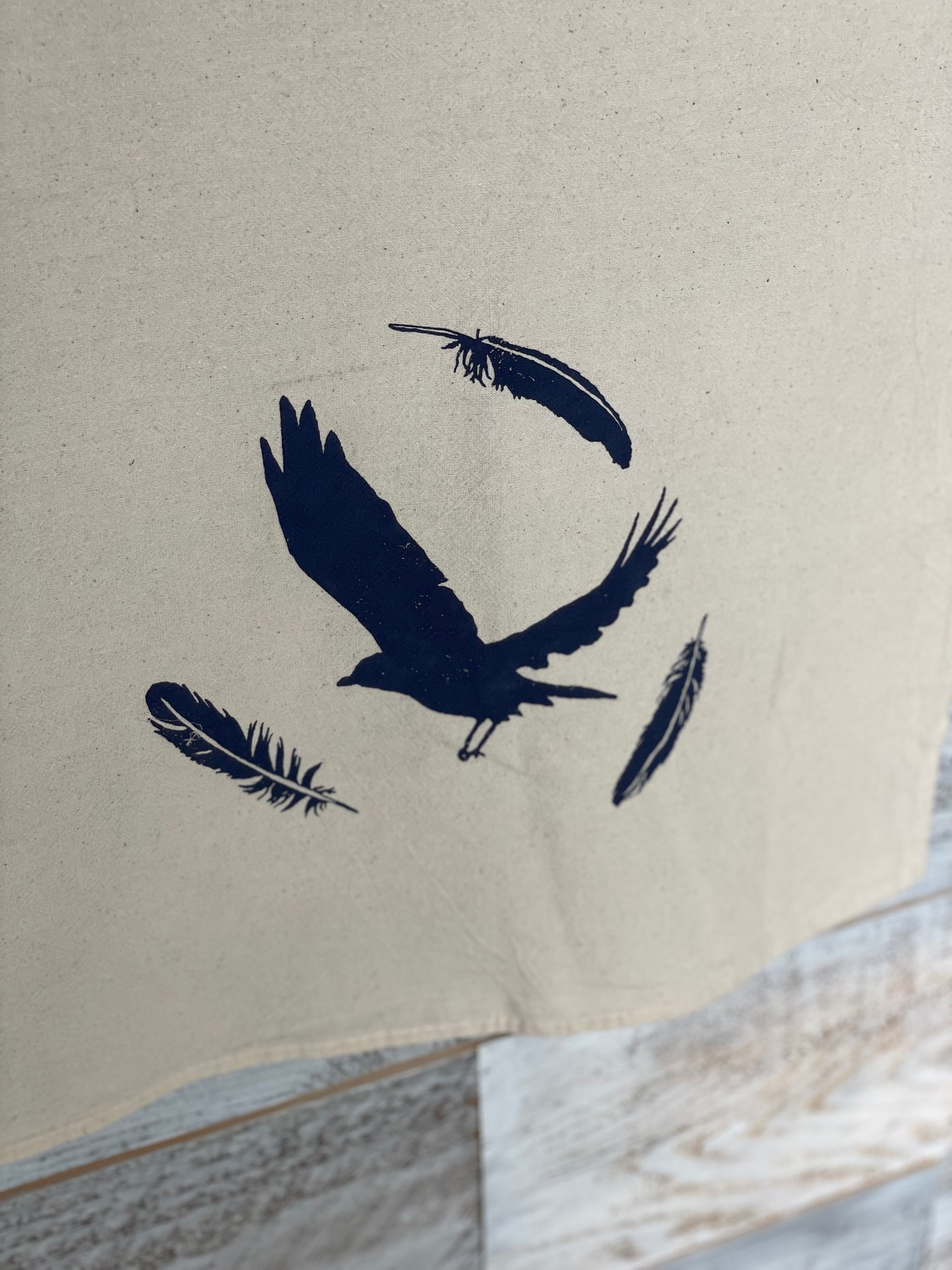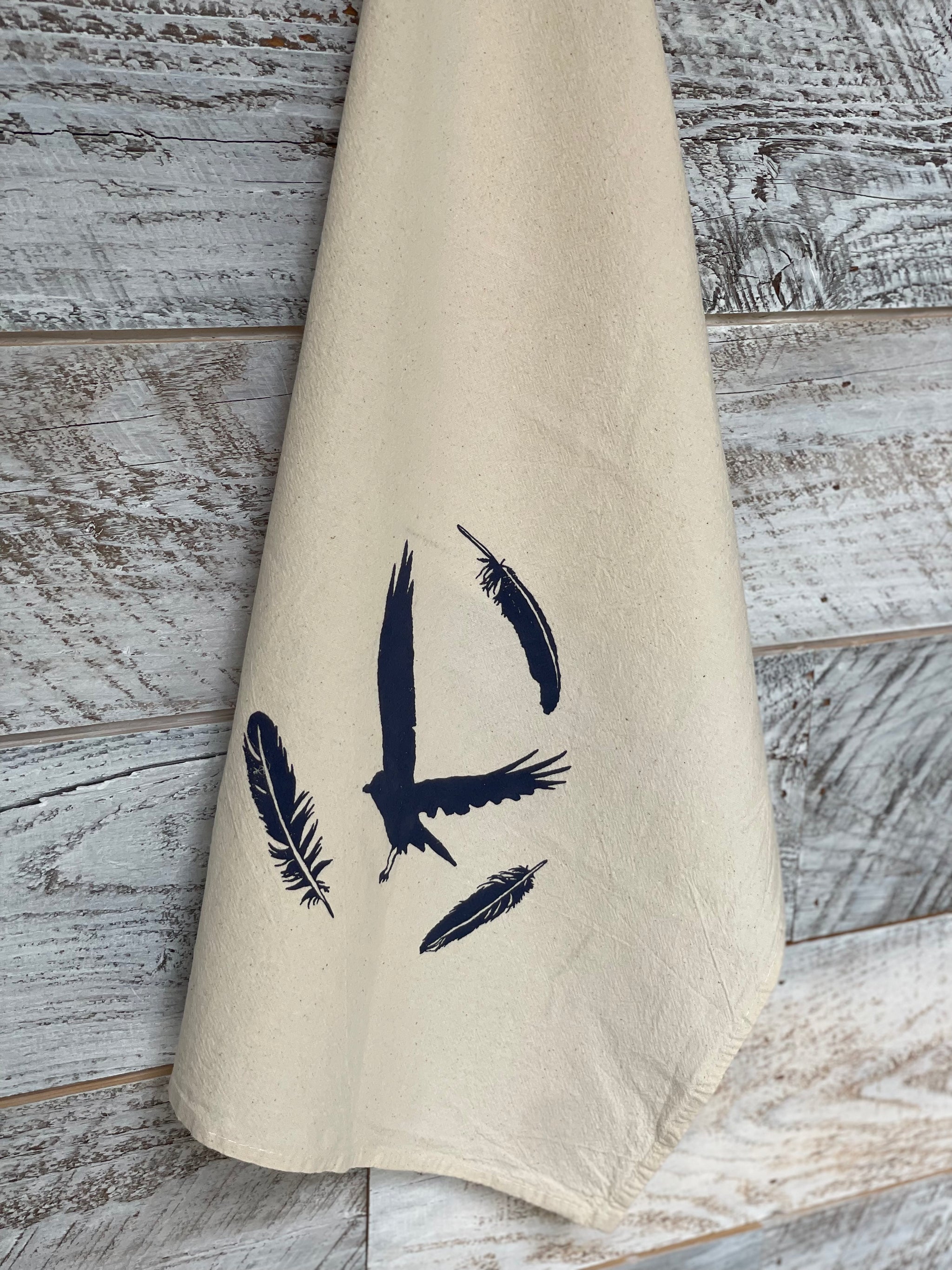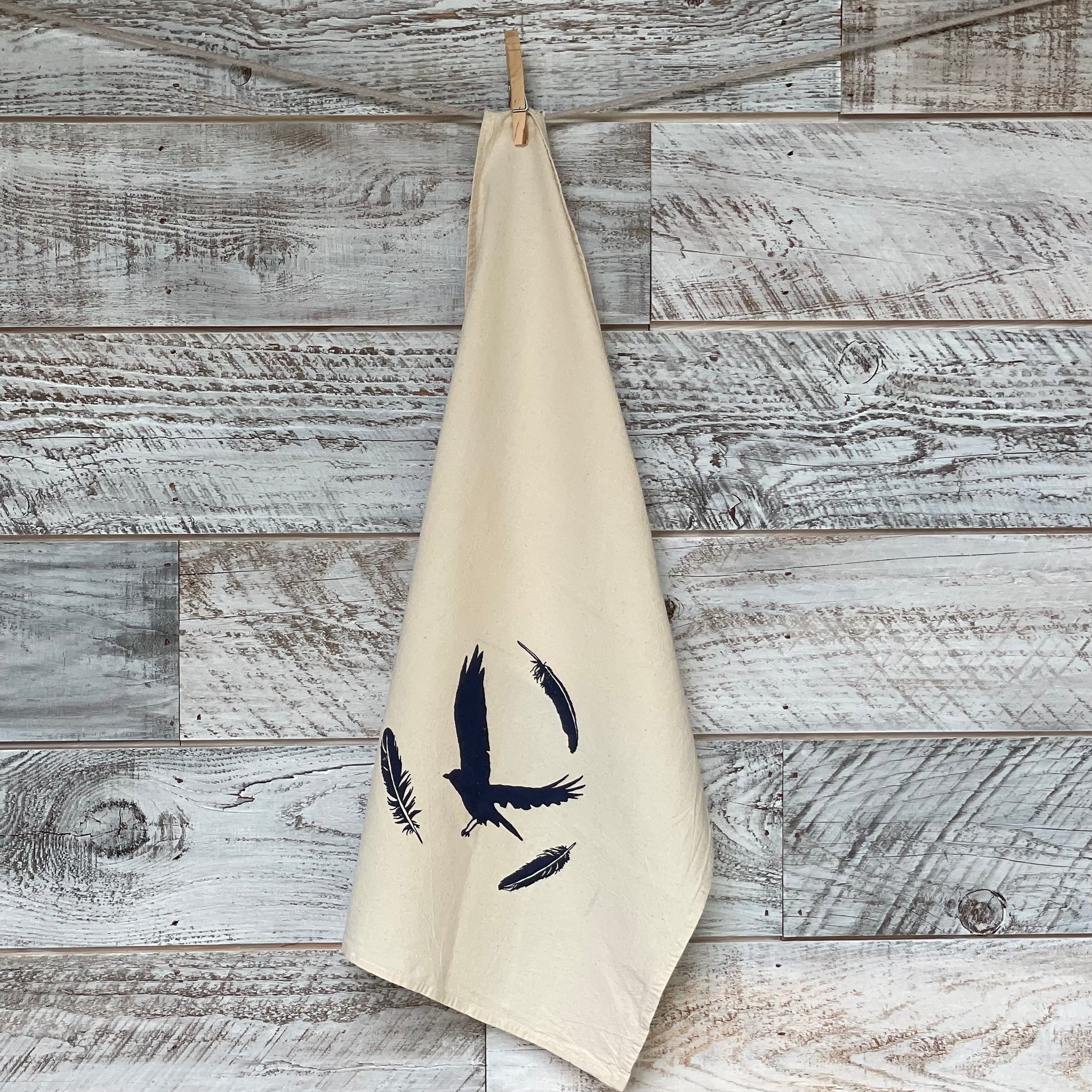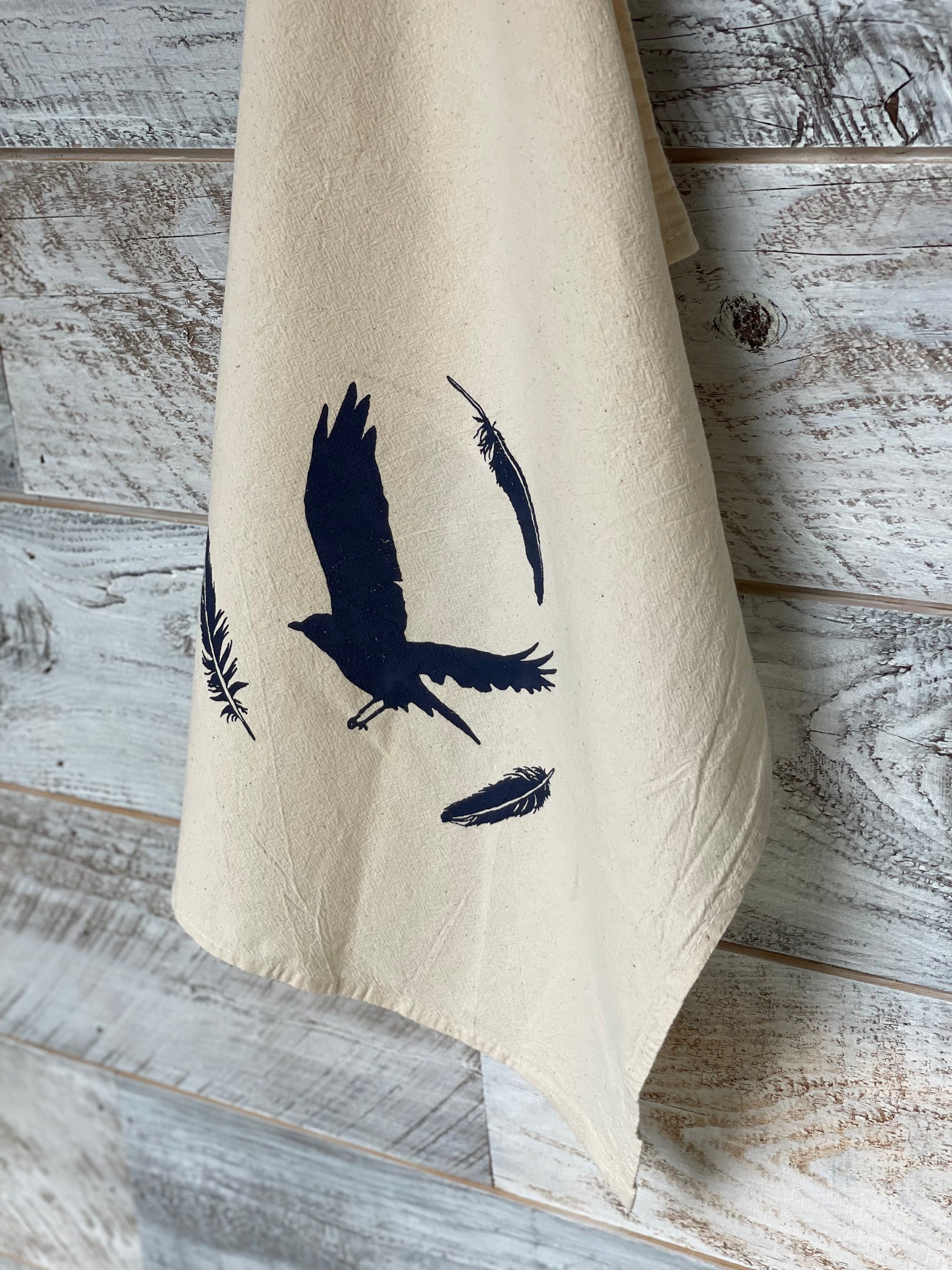 Crow with 3 Feathers design. This tea towel is handprinted onto a 16” x 24” flour sack 100% cotton. There is a loop at the top to hang or you can drape it over your oven door handle. Colors will not fade in the wash and can be cleaned and put in the dryer with other laundry.